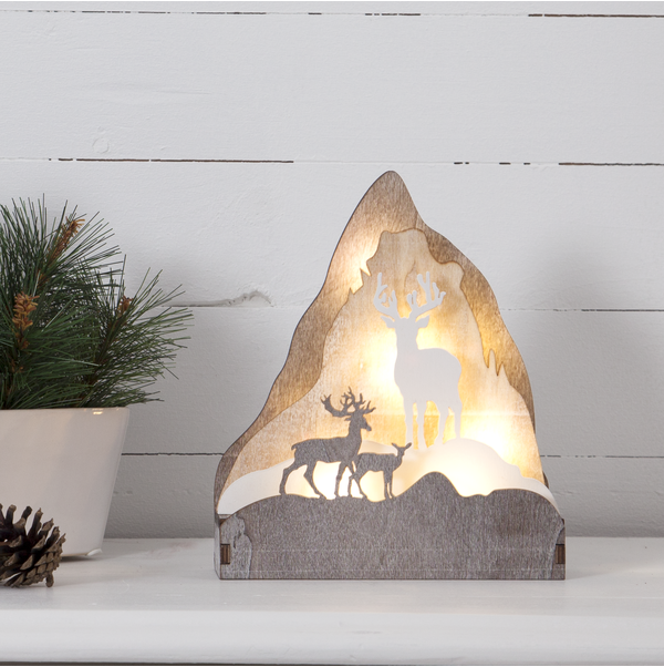 Batteridriven bordsdekoration med varmvitt sken. Dekorationen är av trä och har många fina detaljer. En underbar dekoration som sprider julstämning i hemmet.
