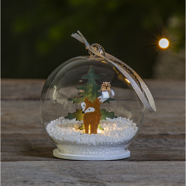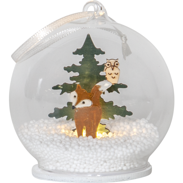 Dekorativ glaskula med sceneri i laserskuren trä. Räven och ugglan väntar på sina vänner för att fira jul tillsammans med dem. Små ledlampor lyser upp motivet och ger en stämningsfull känsla. Produkten drivs av batteri som ingår.