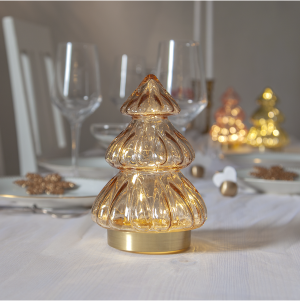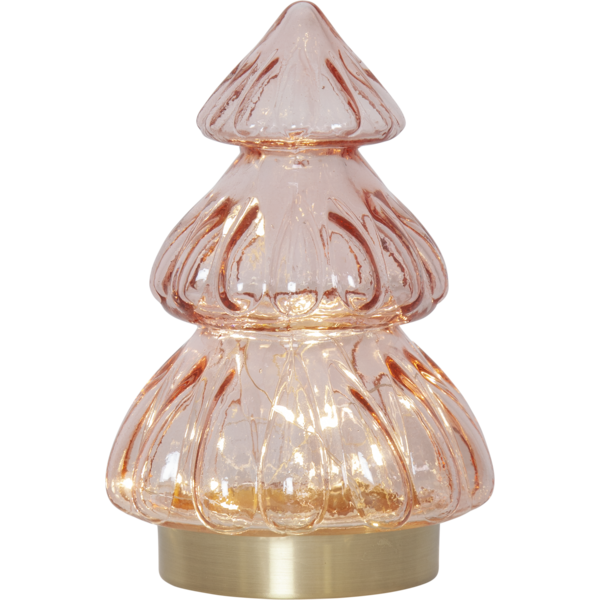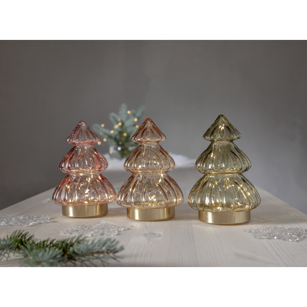 Snygg bordsdekoration i form av en gran i transparent Rosa, Grön eller Beige glas. Guldfärgad bas som gömmer batteriboxen. Drivs av 3 st AAA batterier. Perfekt till dekoration på julbordet. Ger ett hemtrevligt sken i hemmet.