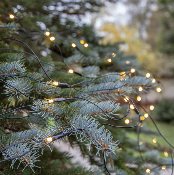 System decor produkter är enkla att använda och även lämpliga inomhus. Produkterna har slanka kablar som är enkla att gömma och ljusstyrkan kan anpassas med dimmer. Nät med 100 st varmvita LED och svart kabel, extraenhet.