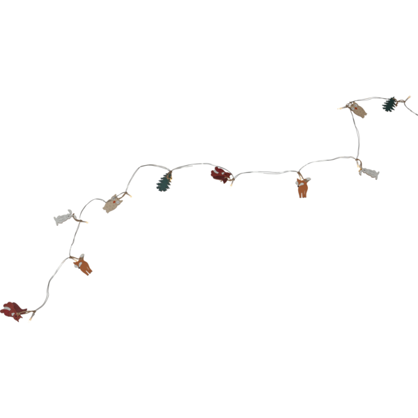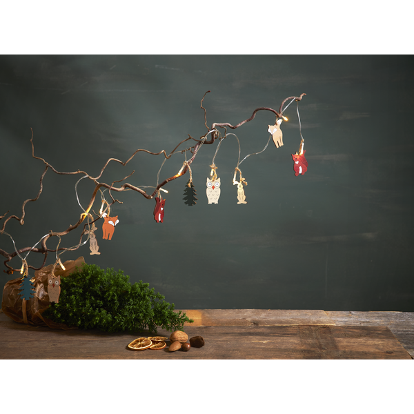 Ljusslinga för inomhusbruk dekorerad med 10 st träfigurer i vackra färger. Figurerna är fastknutna med hampasnöre. Dekorativ inredning som ger ett mysigt sken i hemmet. Passar perfekt till våra övriga produkter i Forest Friends serien.