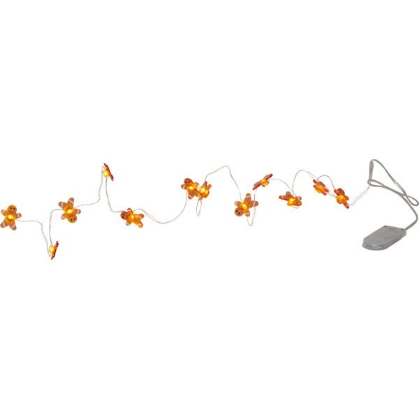 Liten nätt batteridriven ljusslinga med pepparkaksgubbar och silverfärgad metallkabel. 12 st ljuspunkter av dewdrops. Kan användas vid diverse dekorationer, vid tex dukningar, blomsterarrangemang, i fönster osv.