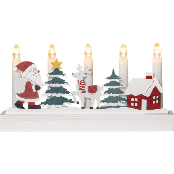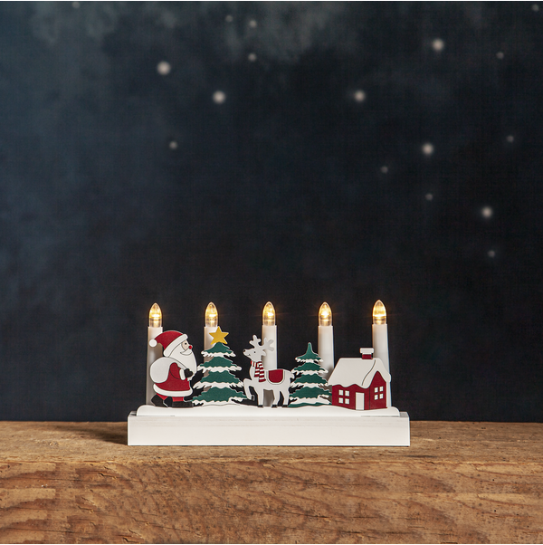 LIten adventljusstake, batteri driven, med laserskuret motiv framför ljuspiporna. Tomte, ren och hus. När produkten är pålagen lyser det int i ljusen. Dekorera till advent och jul, placera ljusstaken i ett fönster eller på en hylla för att få den perfekta julkänslan.