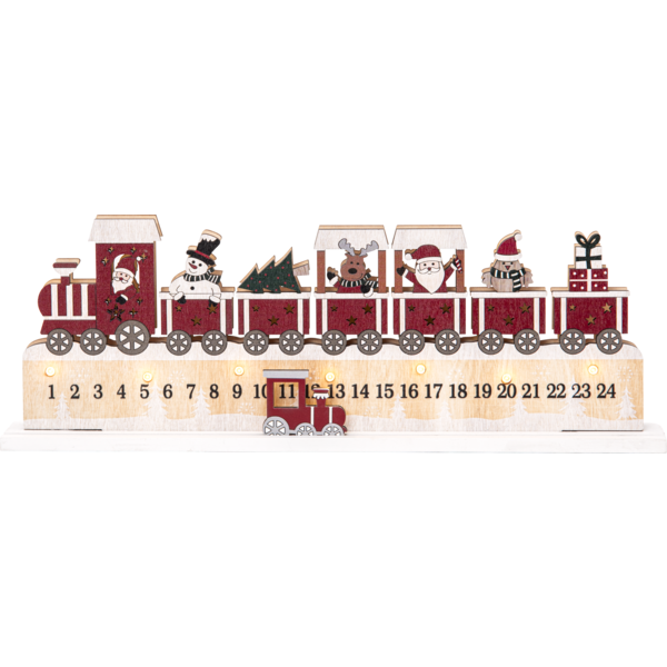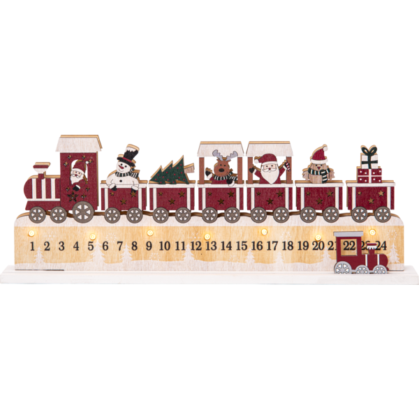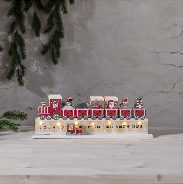Julkalender i form av ett tåg med vagnar och glada passagerare. Räkna dagarna till julafton genom att skjuta fram det lilla loket. Fina julfärger, en klassiker att ta fram från år till år. Små LED punkter som lyser fint och skapar mysig stämning.