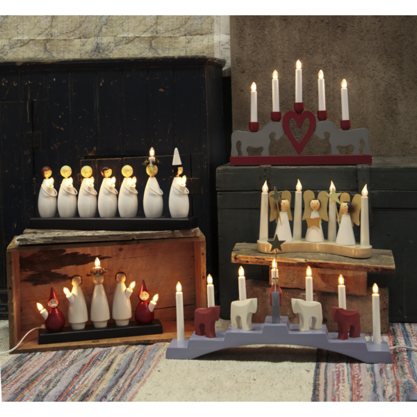 Vacker träljusstake med fina detaljer. Placera ljusstaken exempelvis i fönstret för att skapa en härlig adventstämning i hemmet. Ljusstaken är röd och har 5 ljuskällor.