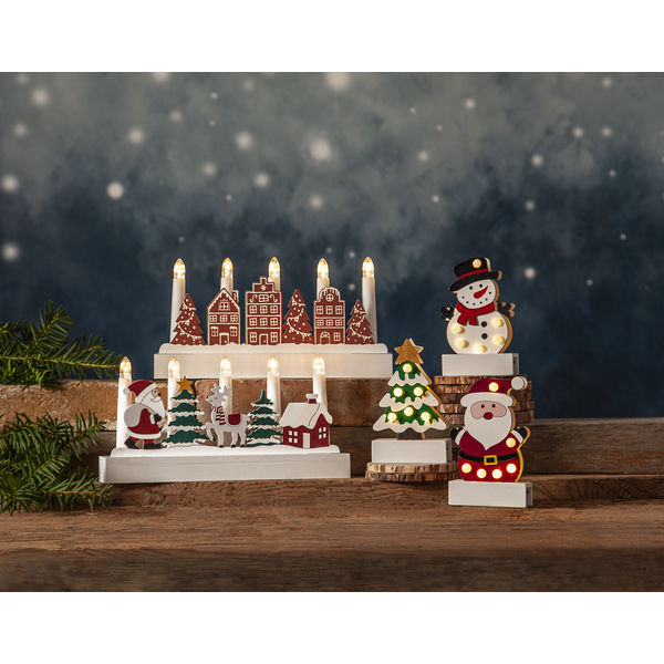 LIten adventljusstake, batteri driven, med laserskuret motiv framför ljuspiporna. Pepparkakshus och granar. När produkten är pålagen lyser det int i ljusen. Dekorera till advent och jul, placera ljusstaken i ett fönster eller på en hylla för att få den perfekta julkänslan.