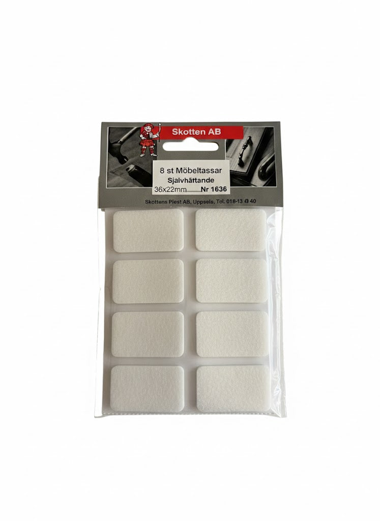 8-pack möbeltassar med självhäftande klister på baksidan. Perfekt för skydda golv eller andra ytor.