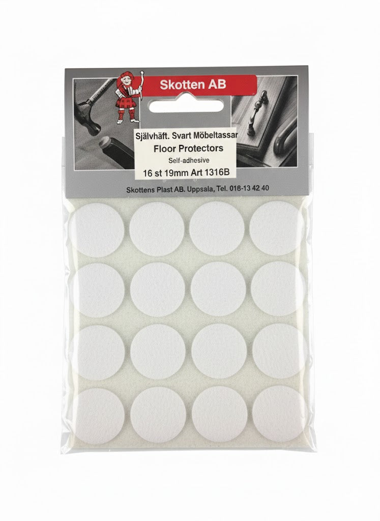 16-pack möbeltassar med självhäftande klister på baksidan. Perfekt för skydda golv eller andra ytor