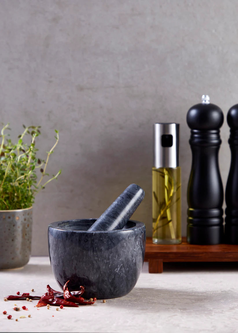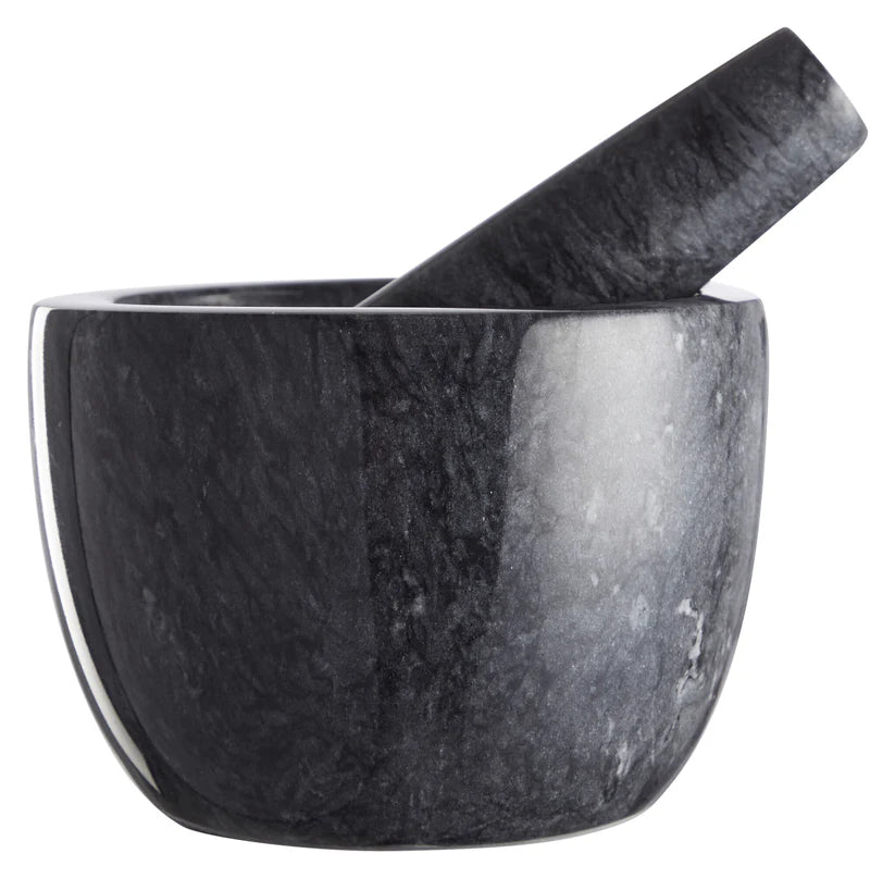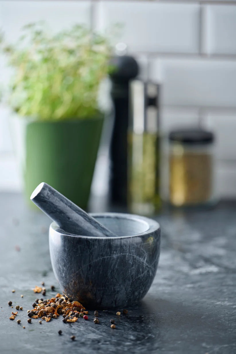 Mortel borde finnas i varje kök, det finns inget annat sätt att verkligen få fram smakerna i kryddor, både torra och färska. Denna mortel är utmärkt eftersom den är väldigt tung och har en grov mitt