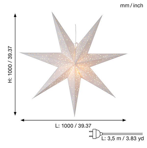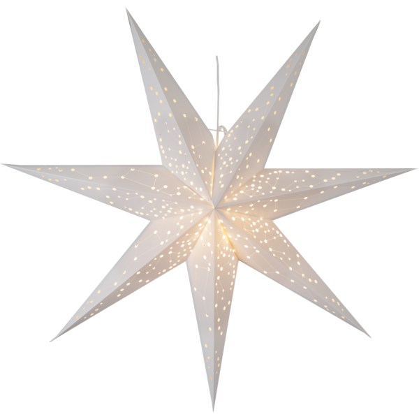 Mönstrad pappersstjärna i vit design. En vacker stjärna att dekorera med i fönstret. Stjärnan har plats för en ljuskälla. Höjden är 100cm.