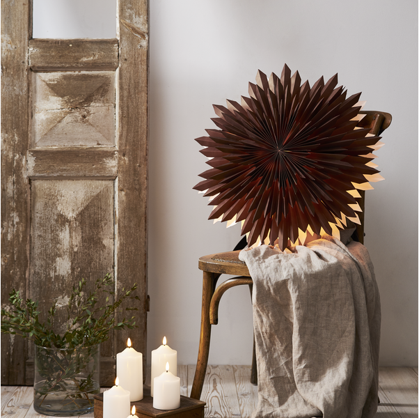 Fantastisk brun pappersstjärna som är tillverkad av tre lager veckat papper. Konturen är lite ojämn för en vintrigare känsla. Ett elegant band ingår för att lättare kunna hänga upp stjärnan. Stjärnan sprider stämning och ger hemmet den där speciella julkänslan. Kan hängas både i förnster och mot en vägg.