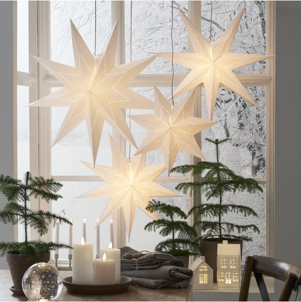 Vit pappersstjärna med hålmönster i form av en stjärna. Dekorera med till jul och advent. Häng en eller flera stjärnor tillsammans i ett fönster eller mot en vägg. Stjärnan har plats för en ljuskälla och det följer med ett upphäng för E14 lampa. Denna produkt har FSC®-märkning.