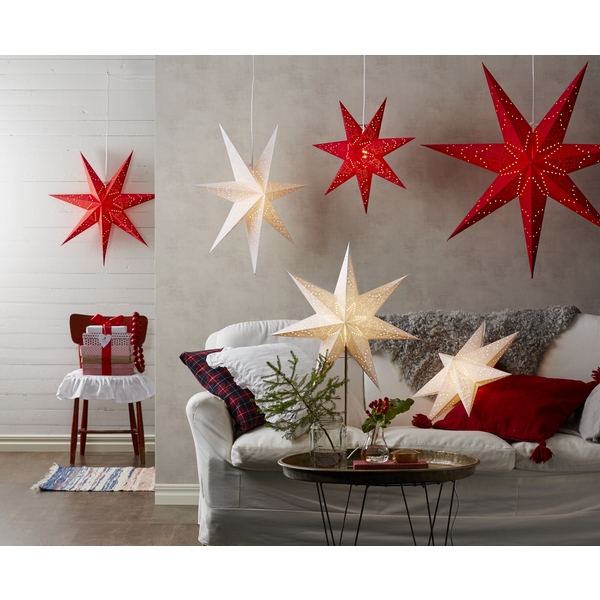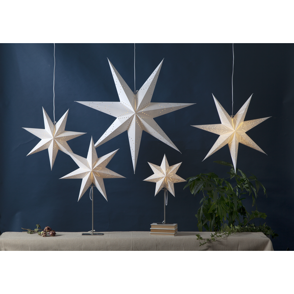 Mönstrad pappersstjärna i vit design En dekorativ stjärna att hänga upp i fönstret. Höjden är 54cm.