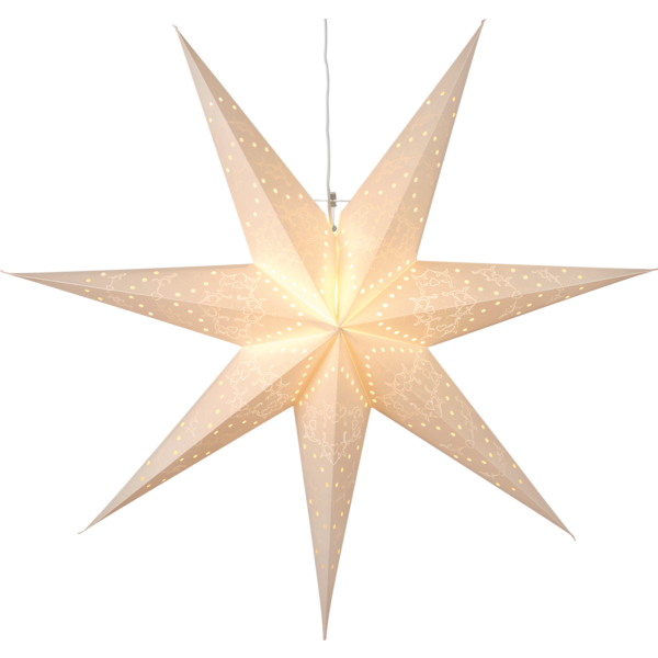 Mönstrad pappersstjärna i vit design. Fin stjärna att dekorera med i fönstret. Stjärnan har plats för en ljuskälla. Höjden är 70cm.