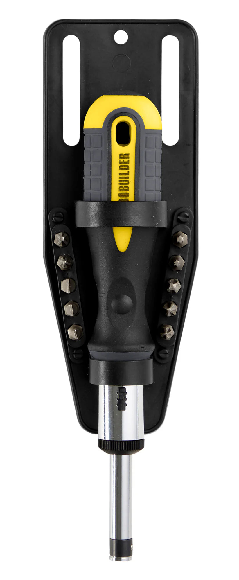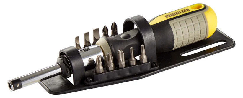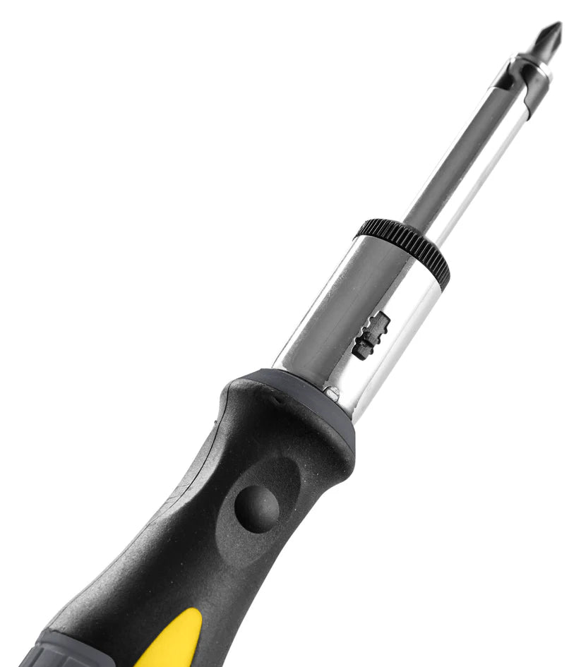 Bitskruvmejsel med spärr och soft grip. Levereras med 10 bits i CRV-stål. Modellen är praktisk, eftersom den innehåller alla de mest normala bitsen, och är trevlig att använda.