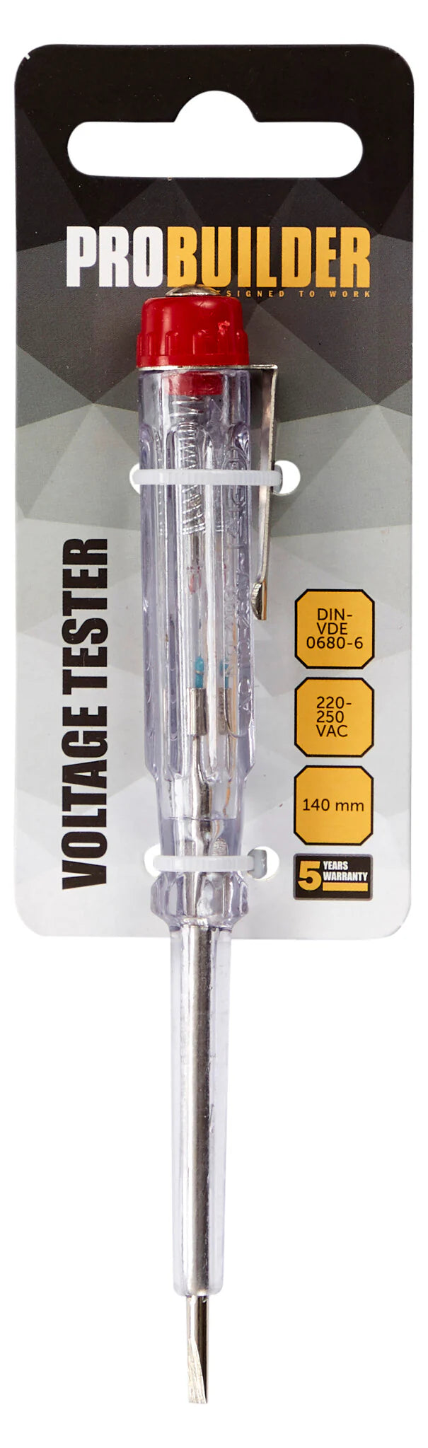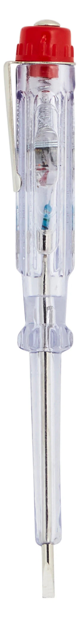 En spänningsprovare kan visa om det finns ström i en stickkontakt. Änden är så liten att den går in i ett av hålen i ett vägguttag och genom att trycka på den röda änden kan du se om det finns någon ström som går igenom. Fungerar med 110-250V AC. Levereras med en skruvmejsel i ena änden.