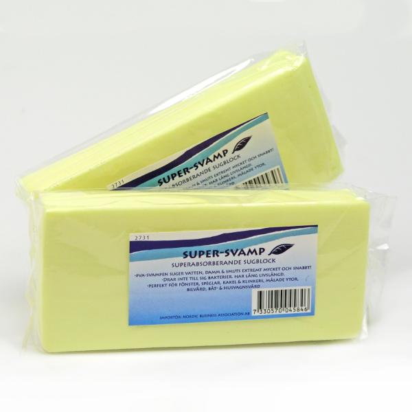 Supersvamp absorberande sugblock. PVA-svampen suger vatten, damm och smuts extremt mycket och snabbt. Drar inte till sig bakterier. Har lång livslängd. Perfekt för fönster, speglar, klinkers, målade ytor, bilvård etc.